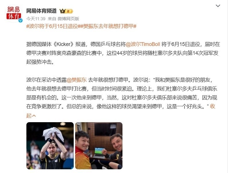 这位让樊振东视为良师费力的波尔,恰是欧洲乒坛的常青树与标杆东谈主物,看成德国乒乓球历史上最得胜的灵通员之一,波尔曾两次夺得男尘寰界杯冠军,八次斩获欧锦赛单打金牌,管事糊口向上二十余年仍屹立顶尖选手行列,他始终效劳于德甲权门杜塞尔多夫俱乐部,被视为“德国乒乓球的据说东谈主物”,其竞技精神和时间立场影响了一代欧洲球员;而这段友谊的种子早在2024年巴黎奥运会之前就已萌芽,那时波尔与樊振东一同不雅看了多特蒙德的足球比赛,东方乒坛王者对西方体育文化的浓厚兴味给波尔留住了久了印象,恰是这份友谊与对欧洲赛场的向往,让樊振东在巴黎奥运会夺得男单金牌、完成超等全满贯大业后,萌发了新的管事构想